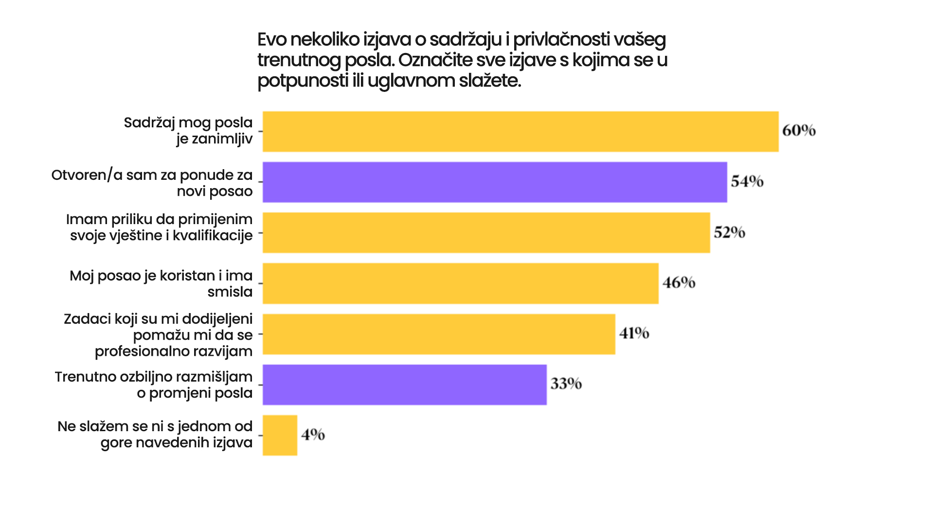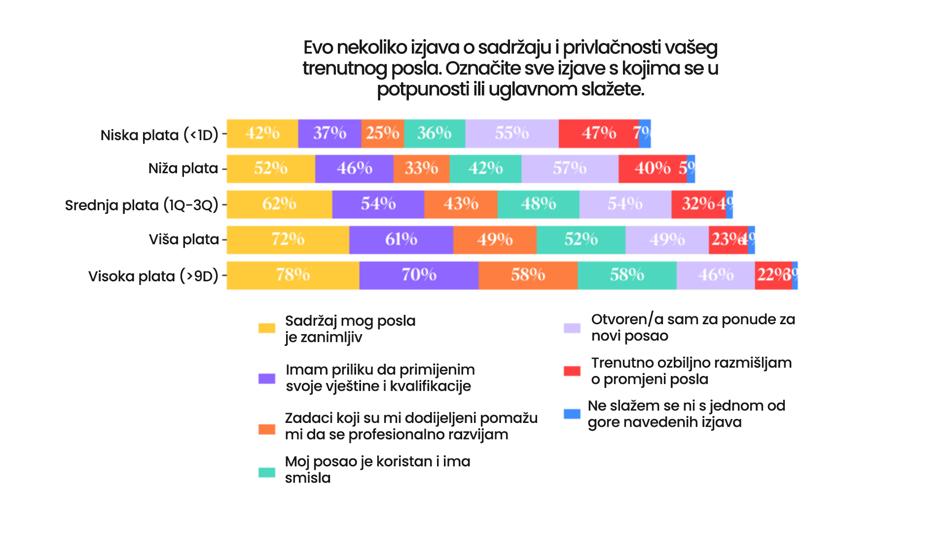 Više od 56% ispitanika imalo je priliku za obuku u posljednjih šest mjeseci, a gotovo 60% svoj posao opisuje kao smislen. Ipak, i uz visoku angažovanost, želja za promjenom ostaje snažna. Čak 55% zaposlenih s nižim primanjima i gotovo polovina onih s višim platama razmotrili bi promjenu posla ako bi im se ukazala bolja prilika.