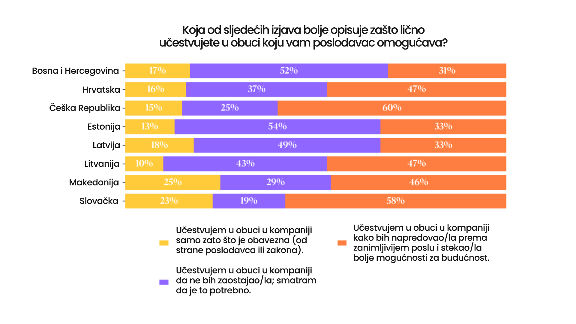 Gotovo polovina zaposlenih vidi obuku ne samo kao ispunjavanje zahtjeva poslodavca, već kao ličnu priliku za razvoj vještina i otvaranje novih karijernih puteva. Ovaj stav nije dominantan u BiH gdje 52% zaposlenika učestvuje u edukaciji jer ne želi da zaostaje na trenutnoj radnoj poziciji.