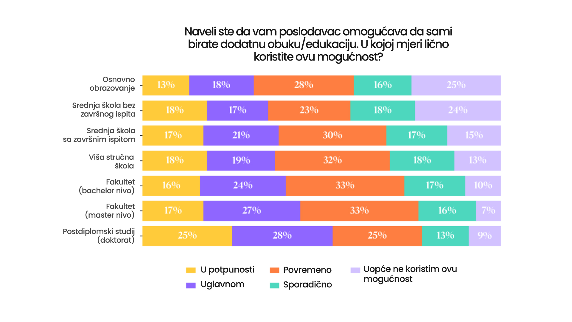 Detaljniji pogled na podatke pokazuje jasan obrazac: što je viši nivo obrazovanja zaposlenog, to je veća motivacija za dalji razvoj i obuku.