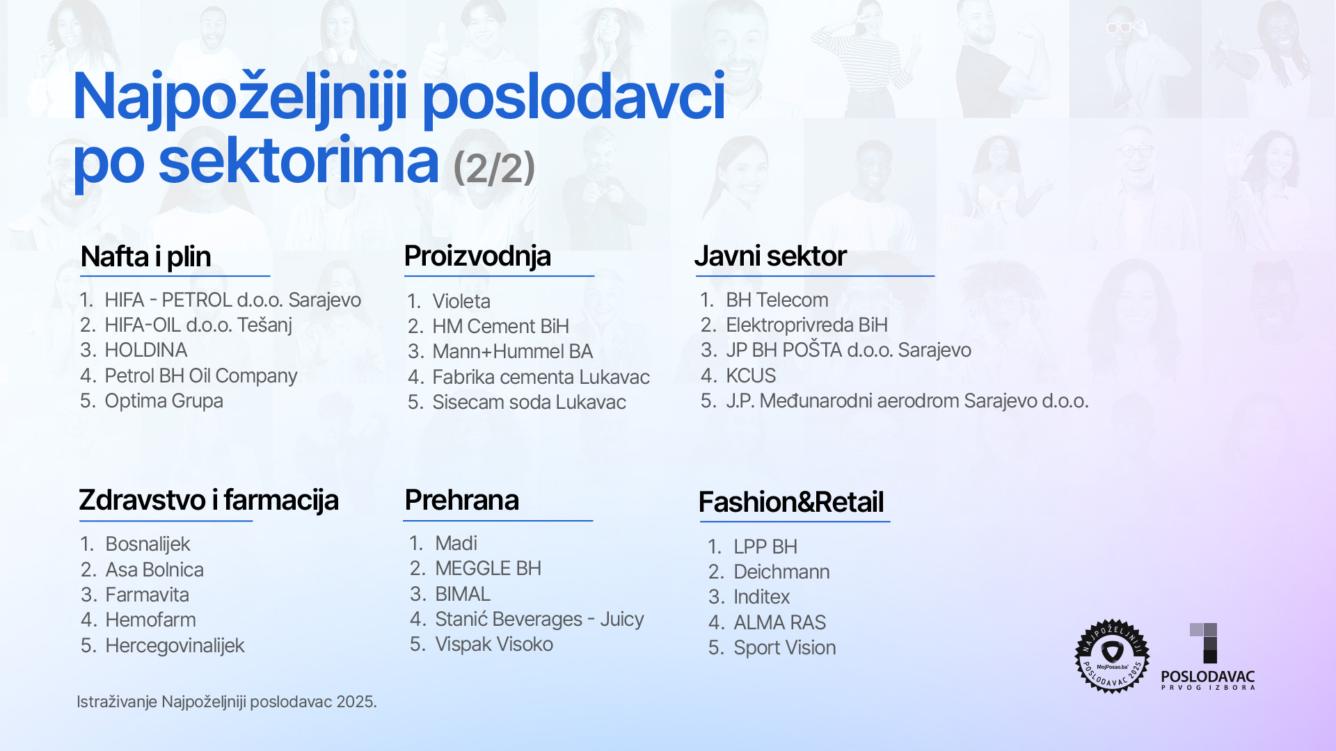 U tom kontekstu, posebno se izdvajaju kompanije koje su rangirane među top 5 najpoželjnijih poslodavaca po sektorima, jer upravo one najbolje odražavaju očekivanja radne snage u svojim industrijama.